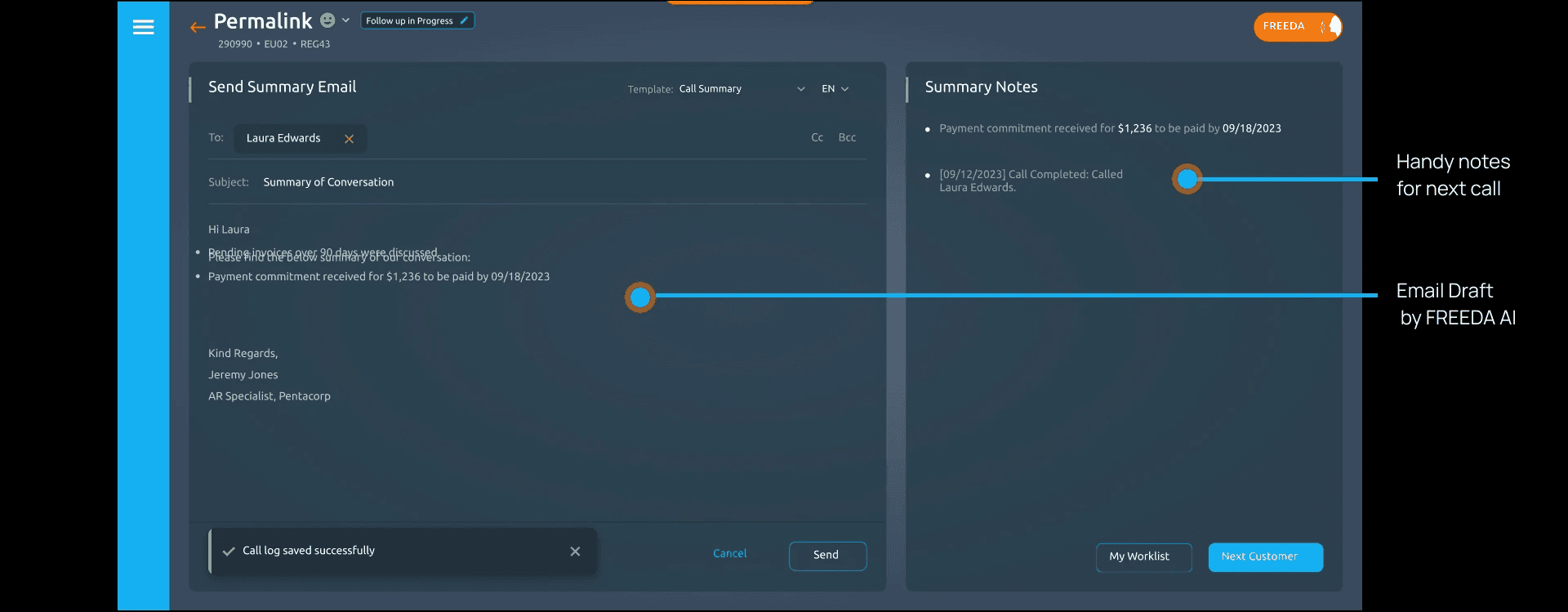 I redesigned the core collections workflow so AR analysts could act faster, combining AI insights, in-app calling, automated summaries, and a structured follow-up system.