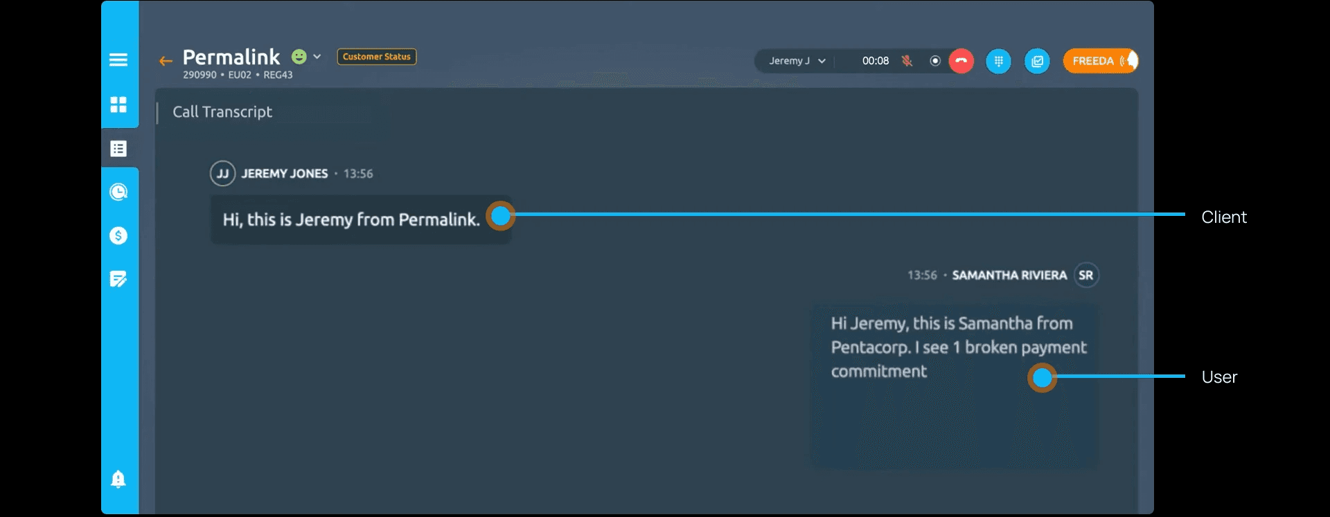 In-app calling screen + contextual panel.