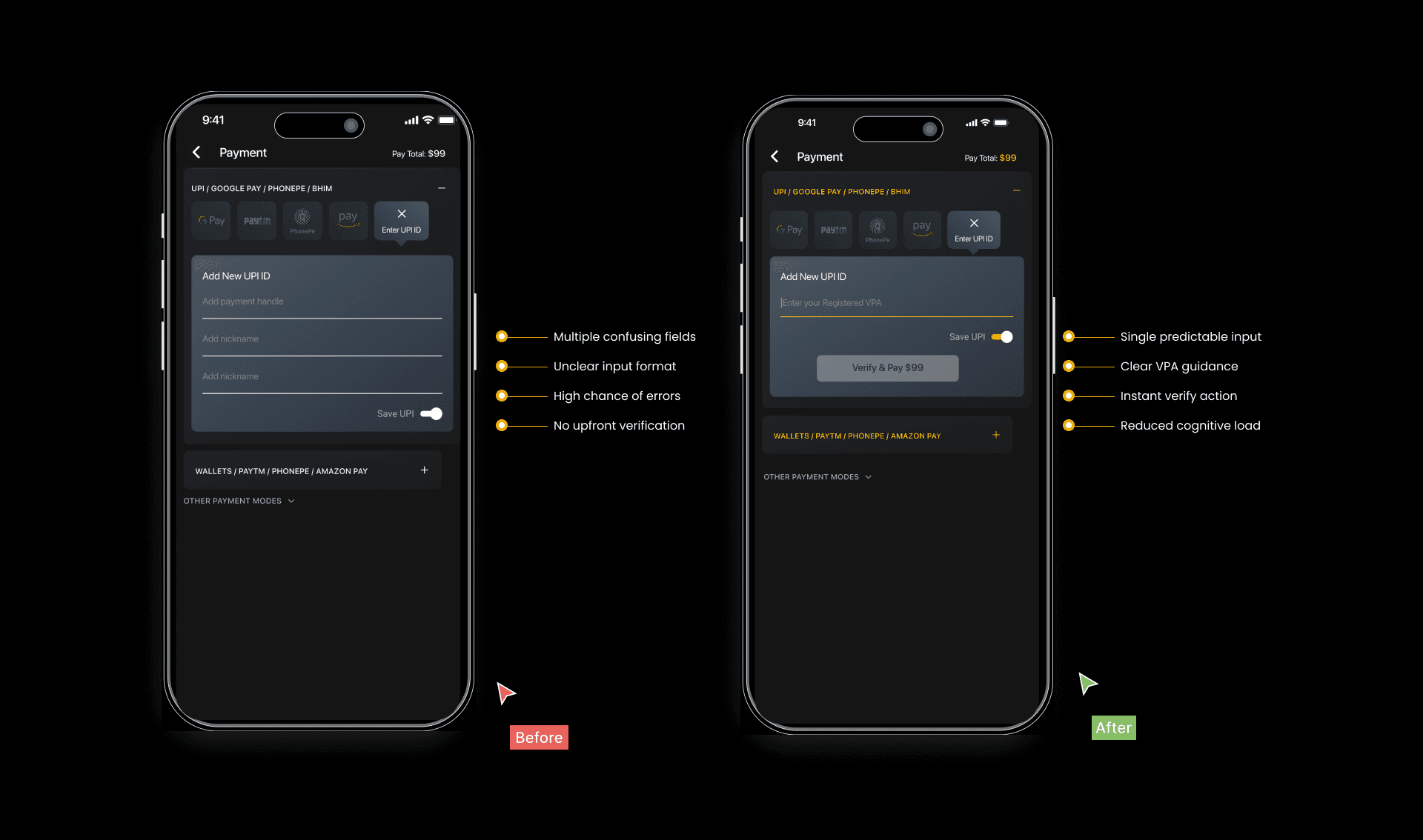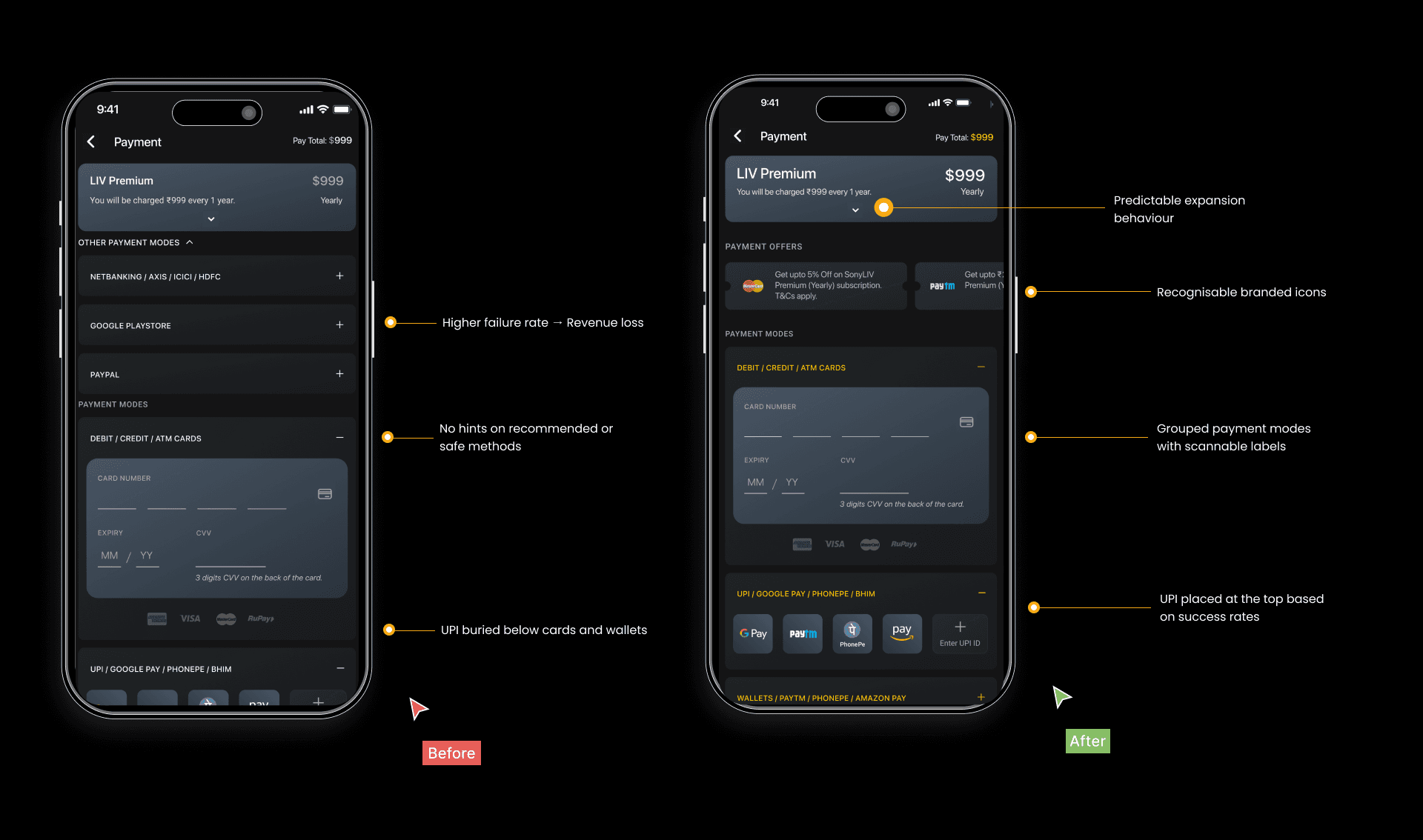 We prioritised UPI visually and structurally to reduce decision time.