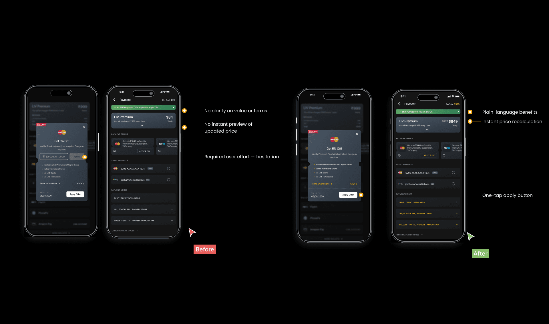 I simplified decision-making, prioritised high-success payment paths, and redesigned failure/retry states so users always knew what to do next.