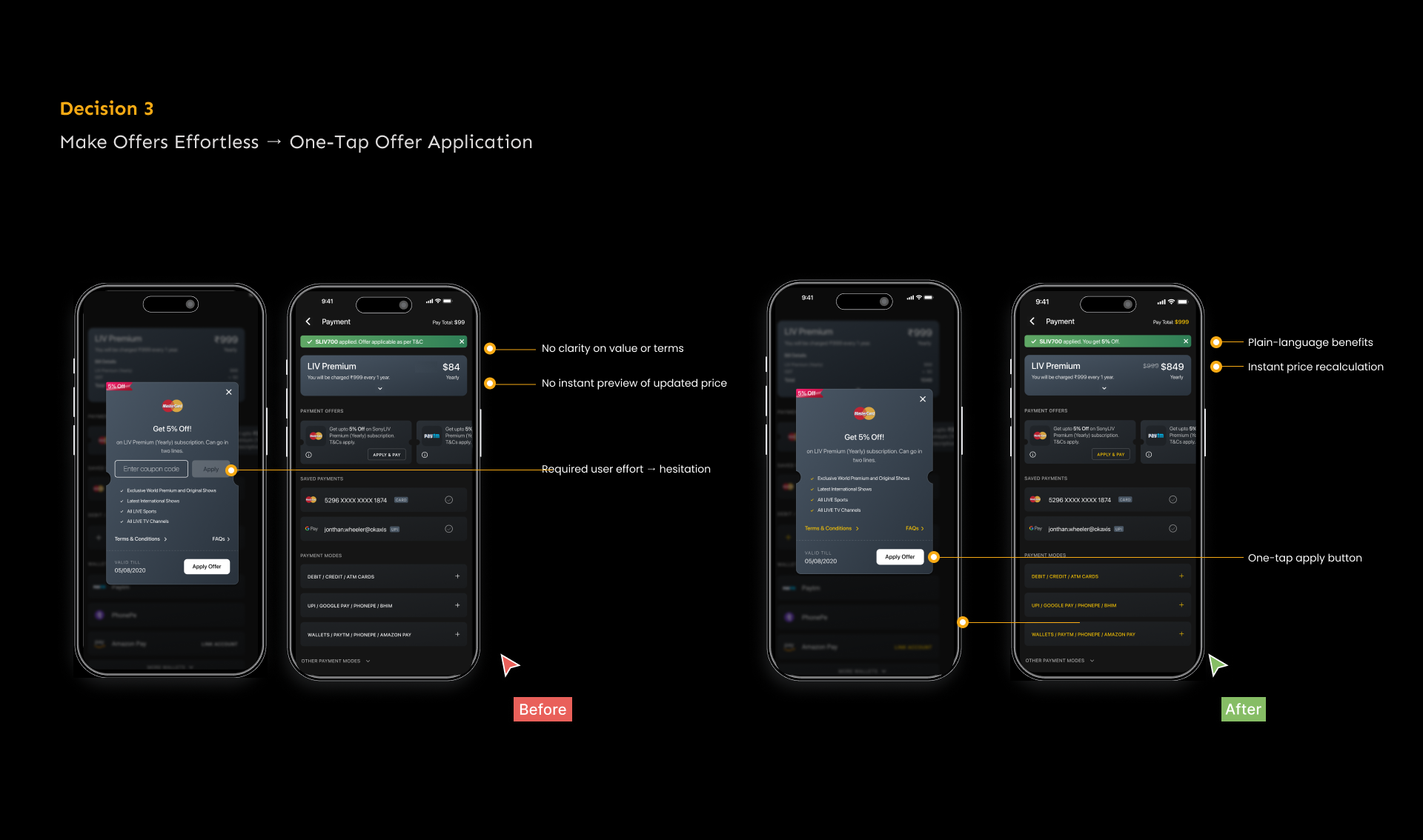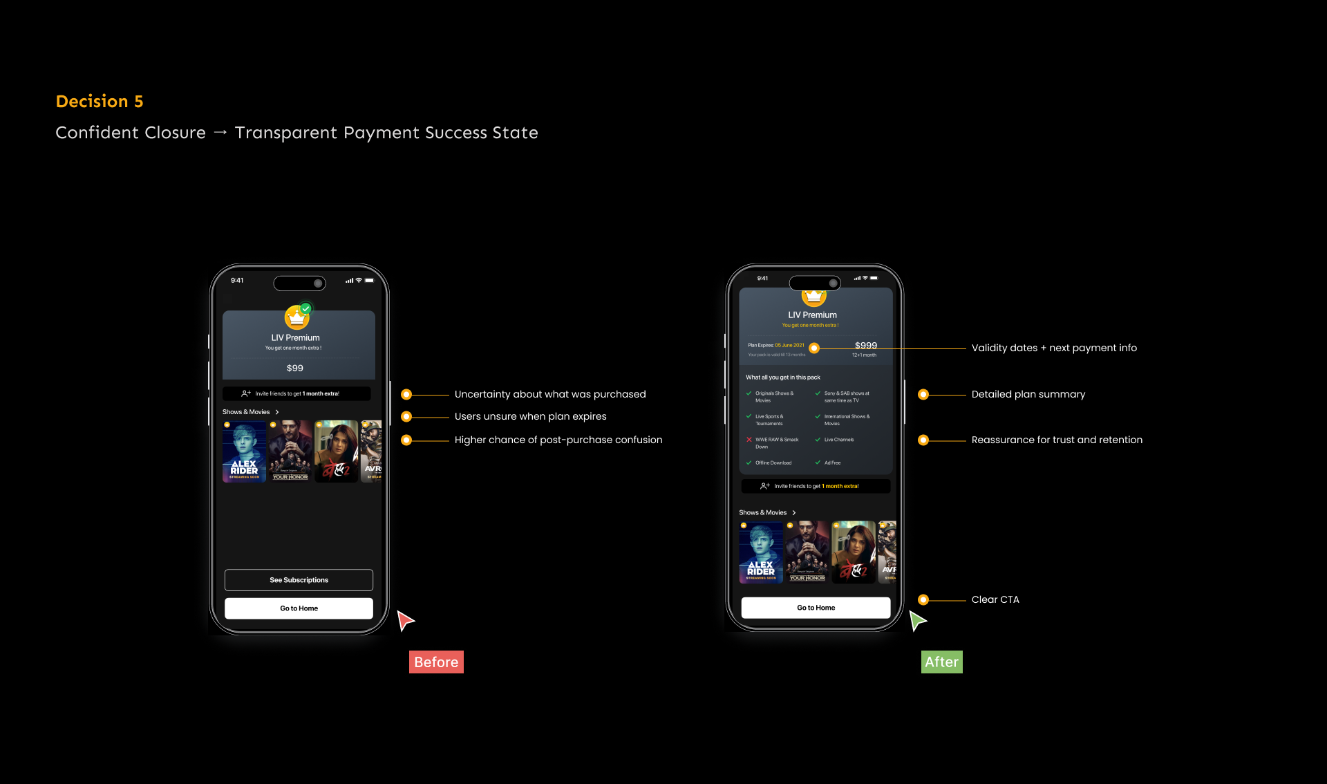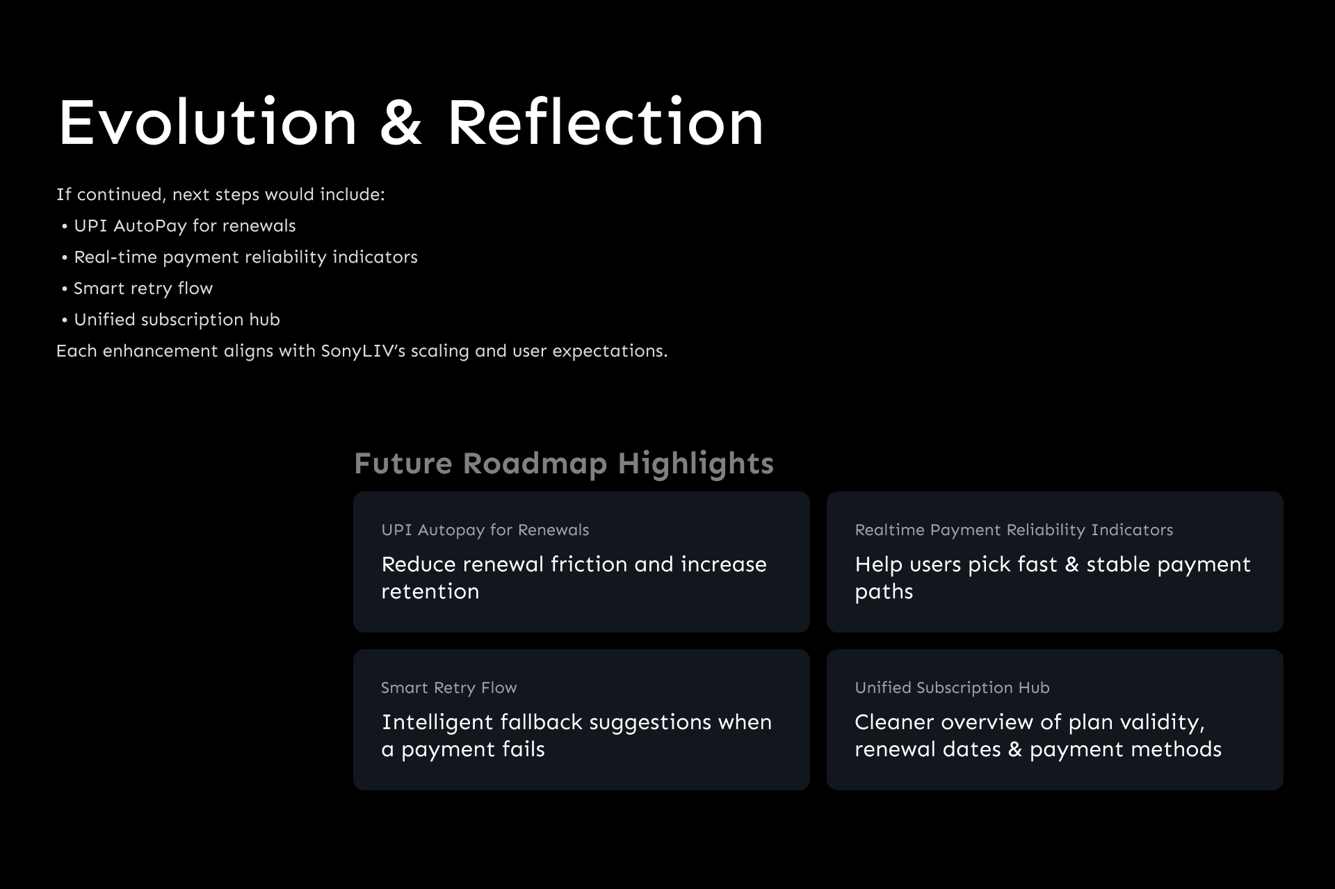 The redesigned checkout experience transformed SonyLIV’s payment journey into a fast, trustworthy, and conversion-driven system. By simplifying decision-making, prioritising high-success methods, and making offers effortless, the new flow successfully aligned user needs with business outcomes, delivering meaningful, measurable results at scale.