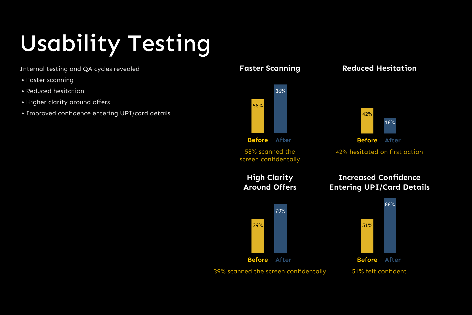 Even without legacy screens, the redesign measurably improved outcomes through stronger hierarchy, faster payment paths, and clarity-first design.