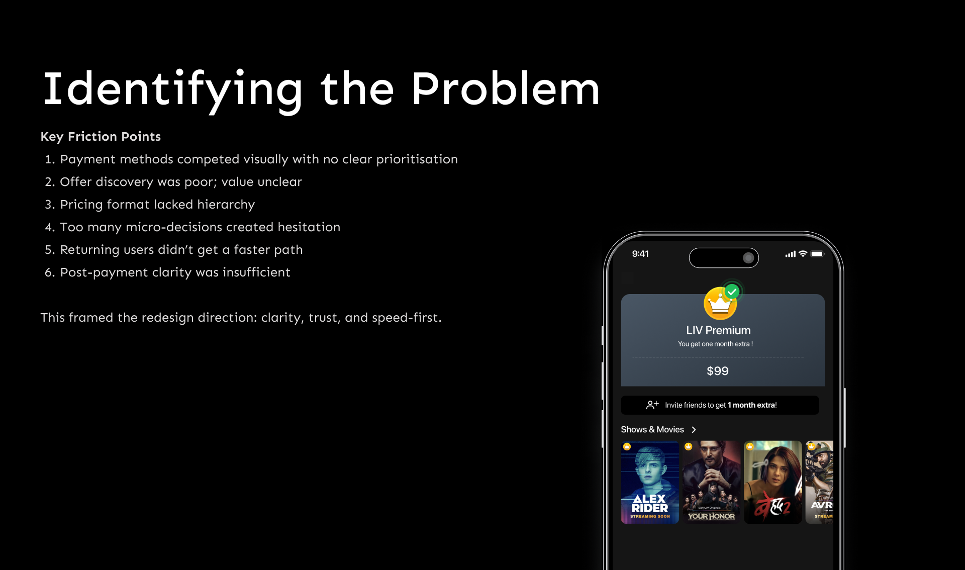 I led the redesign of SonyLIV’s mobile checkout experience end-to-end, creating a clear, trustworthy and faster path to payment while aligning with user behaviour and business goals.