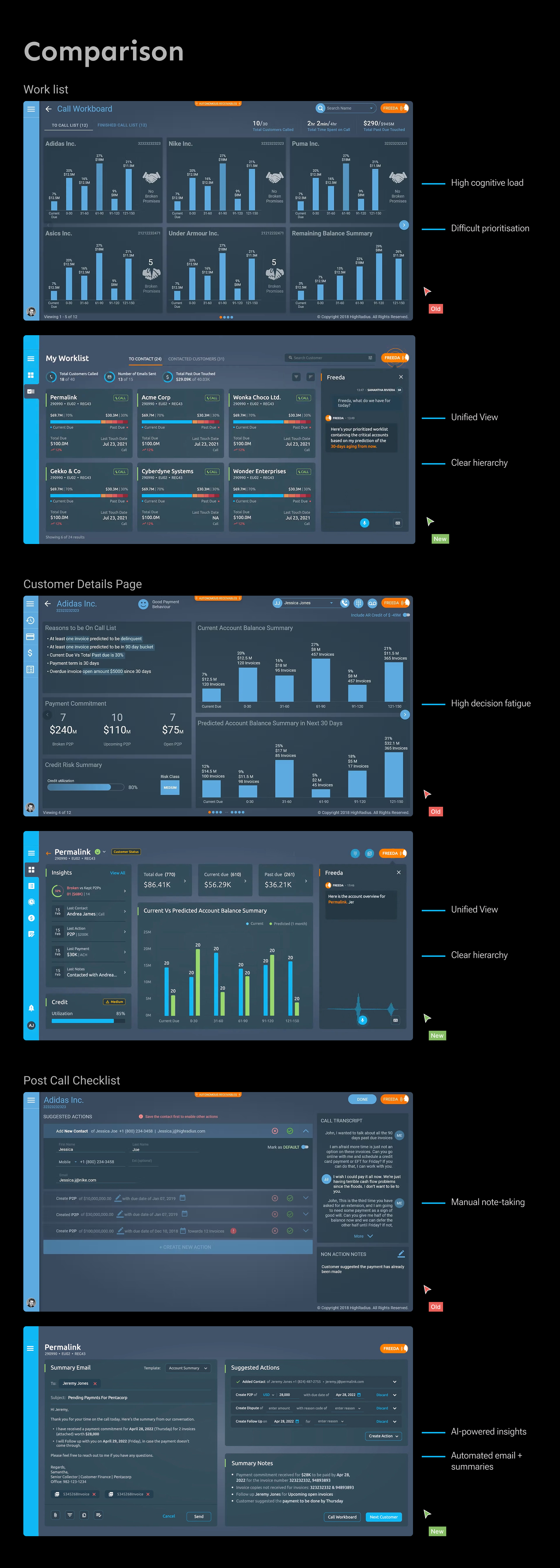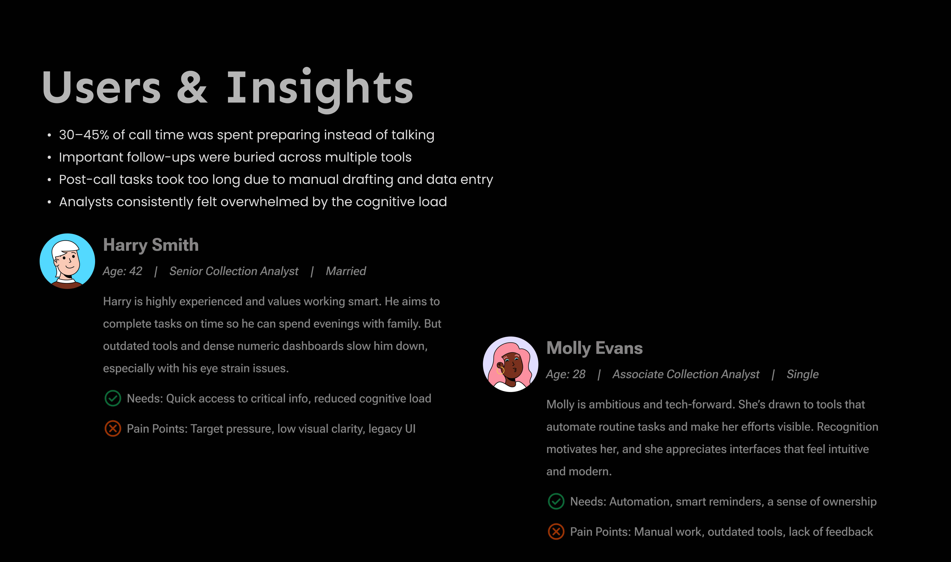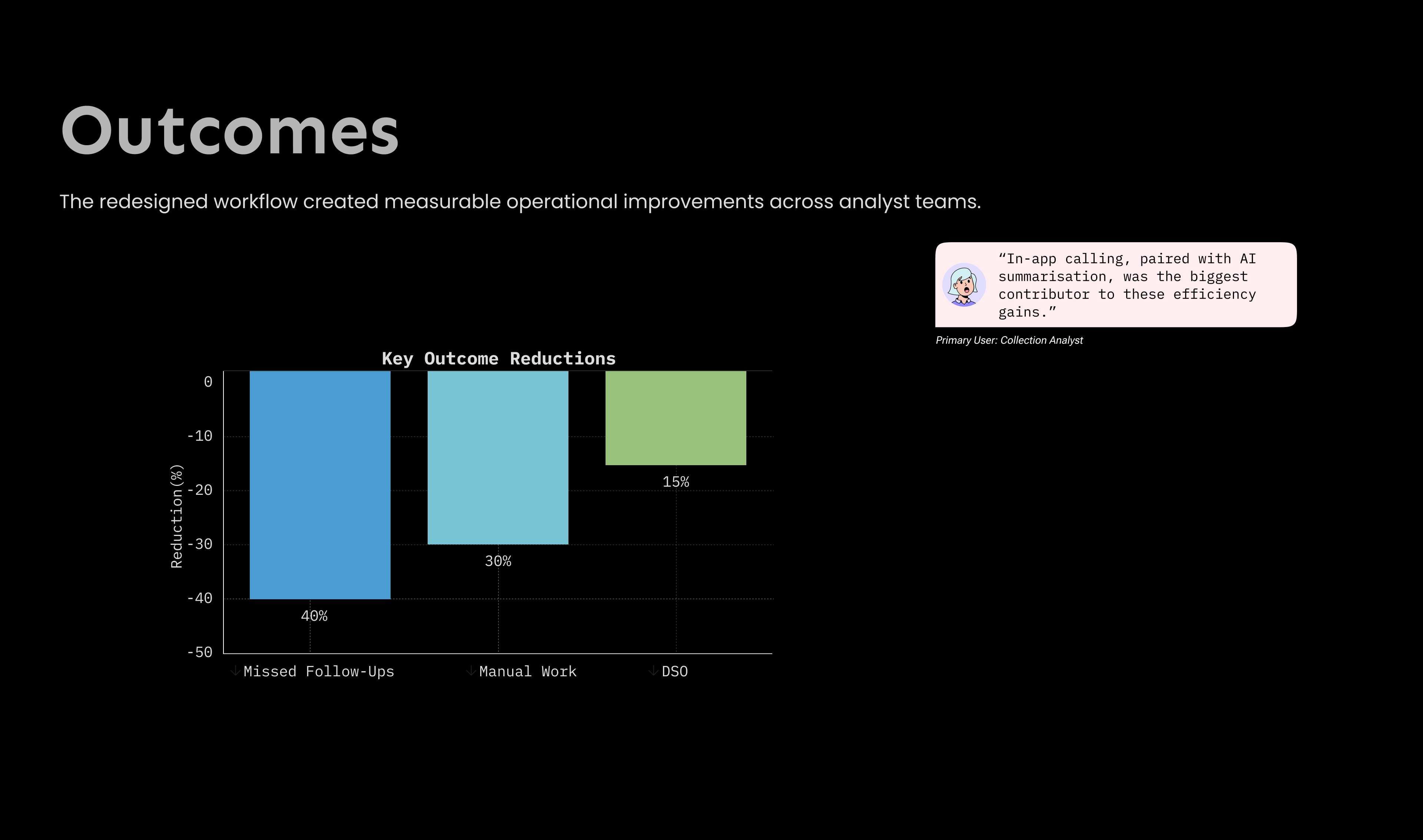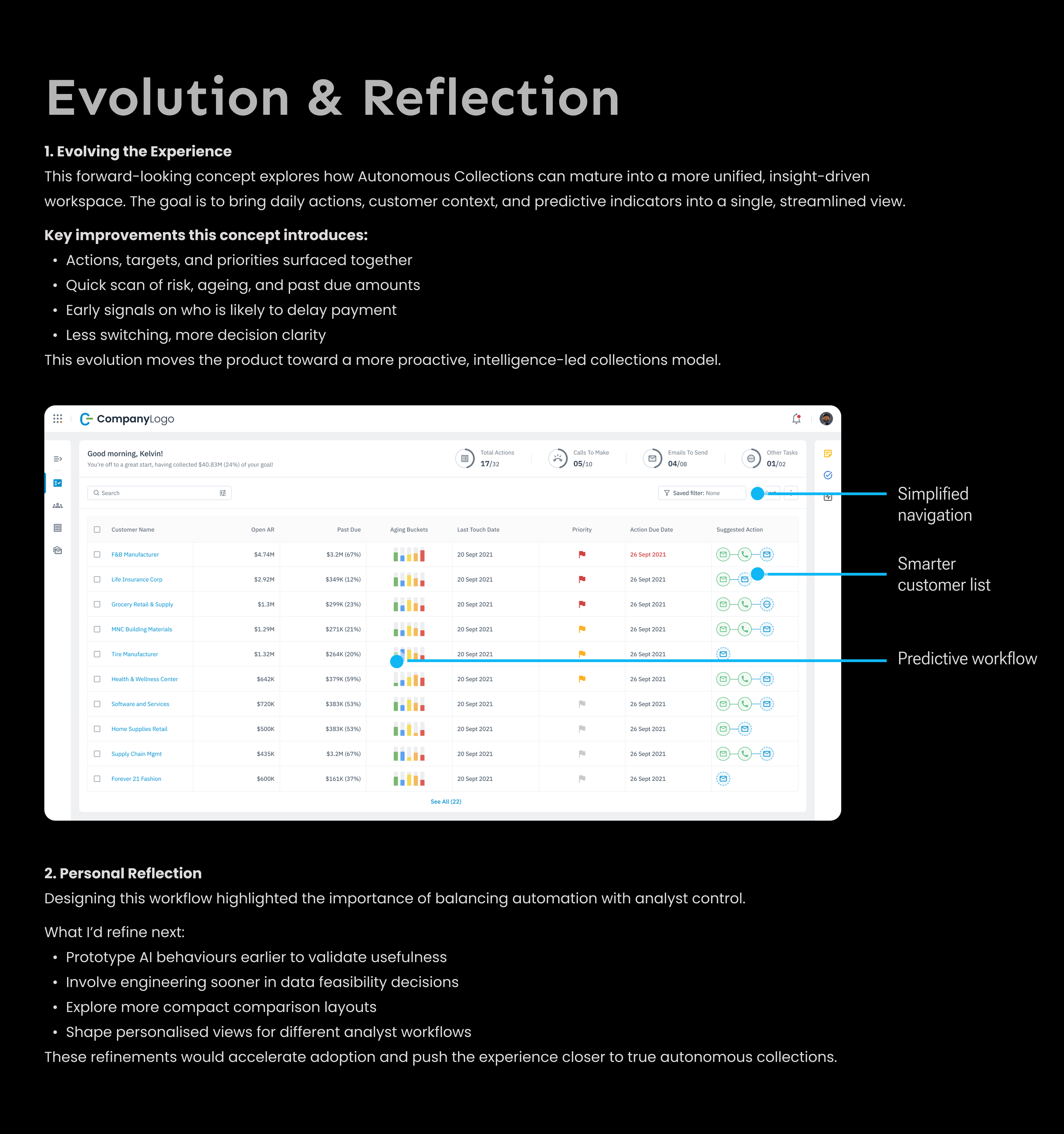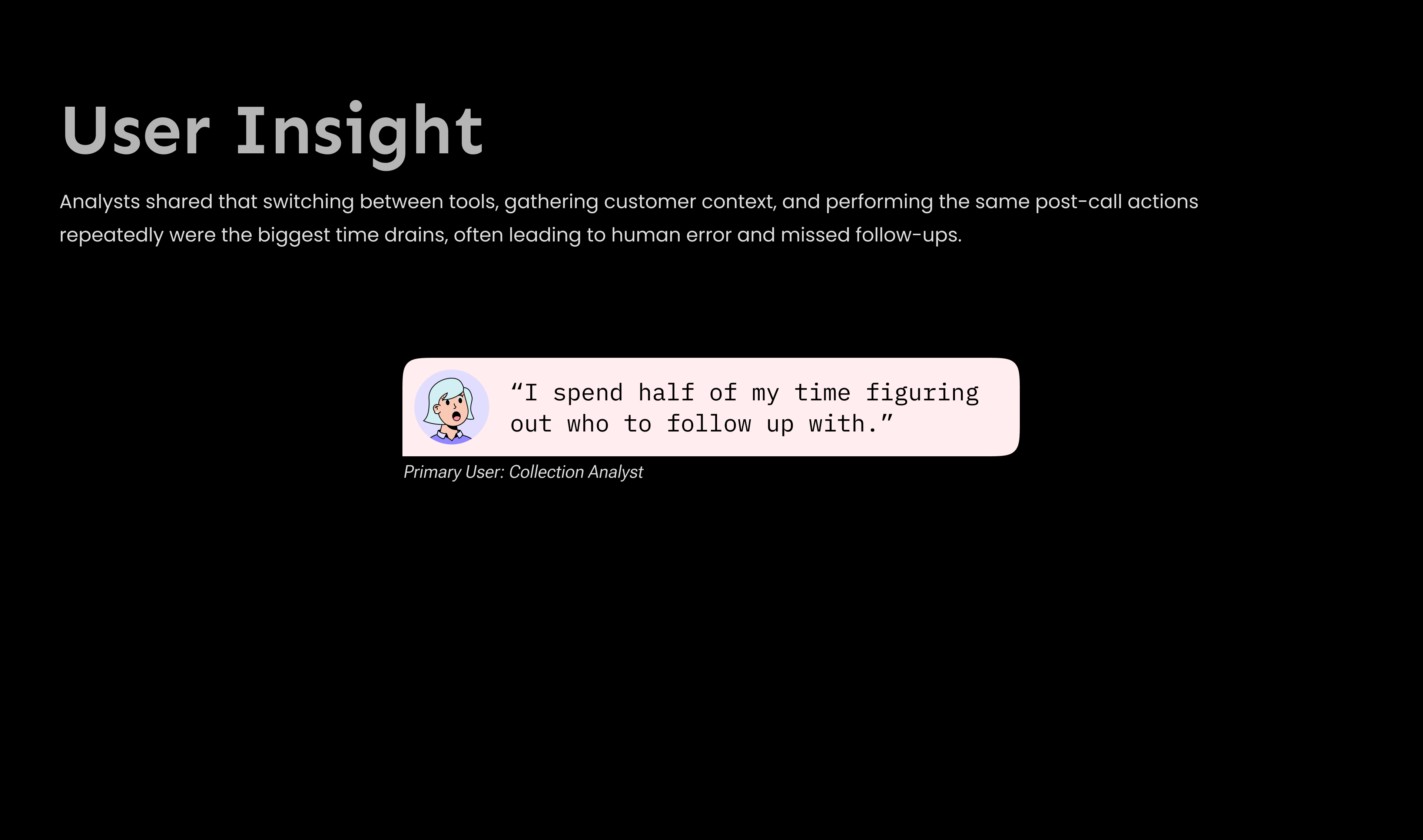 I led the end-to-end redesign of the core Collections workflow, integrating AI-assisted insights, in-app calling, automated summaries, and a structured post-call system to help analysts work faster and more confidently.